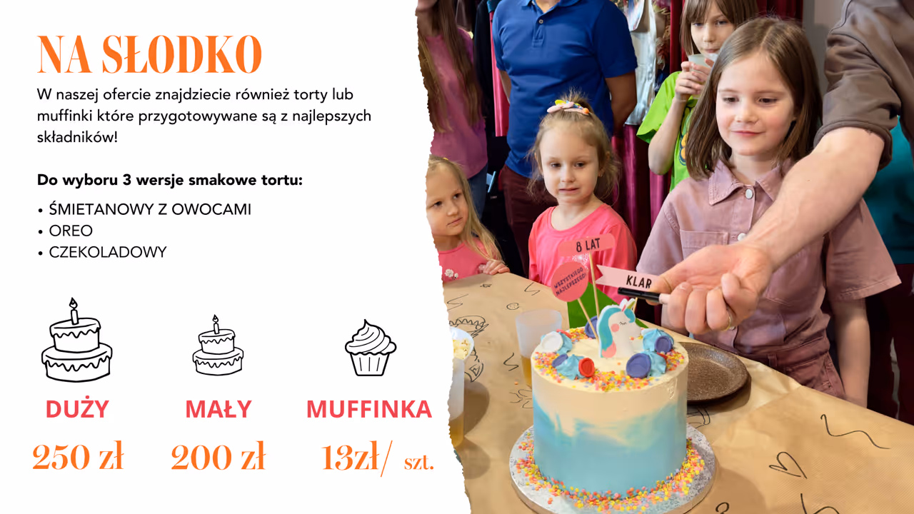 Możliwość zamówienia personalizowanego tortu w aż 3 smakach do wyboru: śmietanka z owocami, oreo lub czekoladowy.