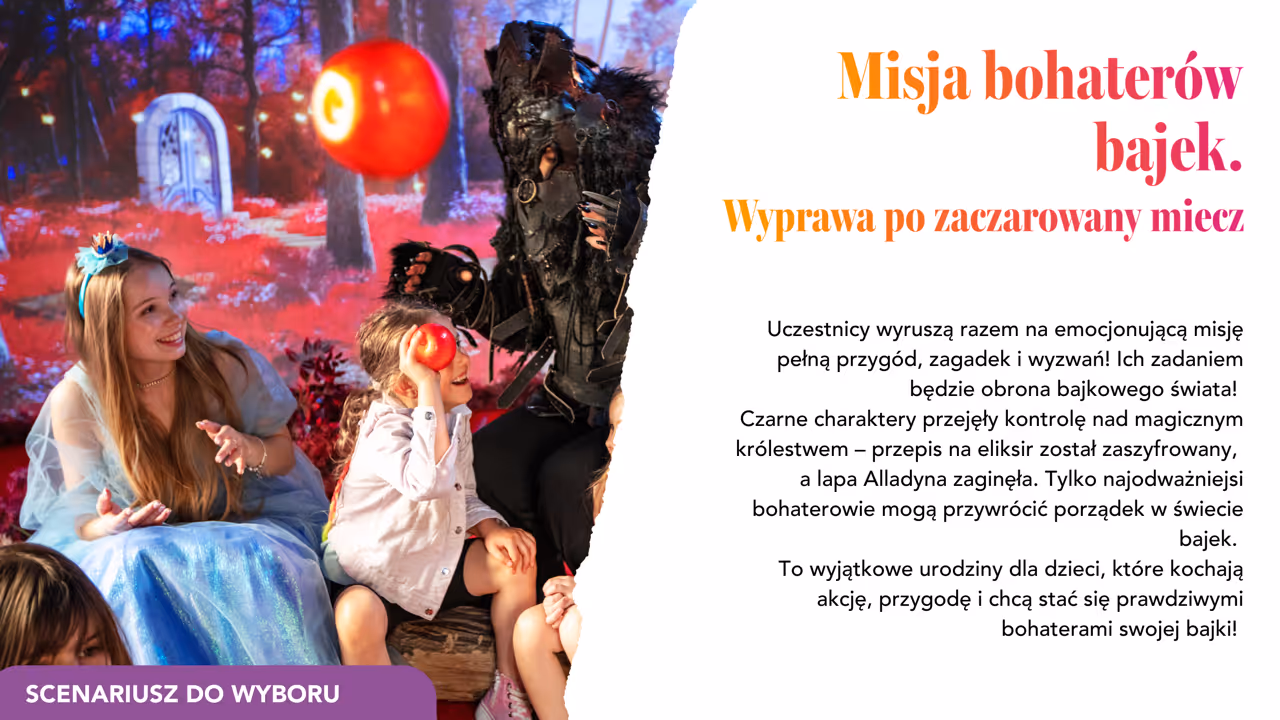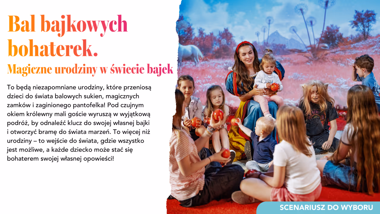 To będą niezapomniane urodziny, które przeniosą dzieci do świata balowych sukien, magicznych zamków i zaginionego pantofelka! Pod czujnym okiem królewny mali goście wyruszą w wyjątkową podróż, by odnaleźć klucz do swojej własnej bajki.